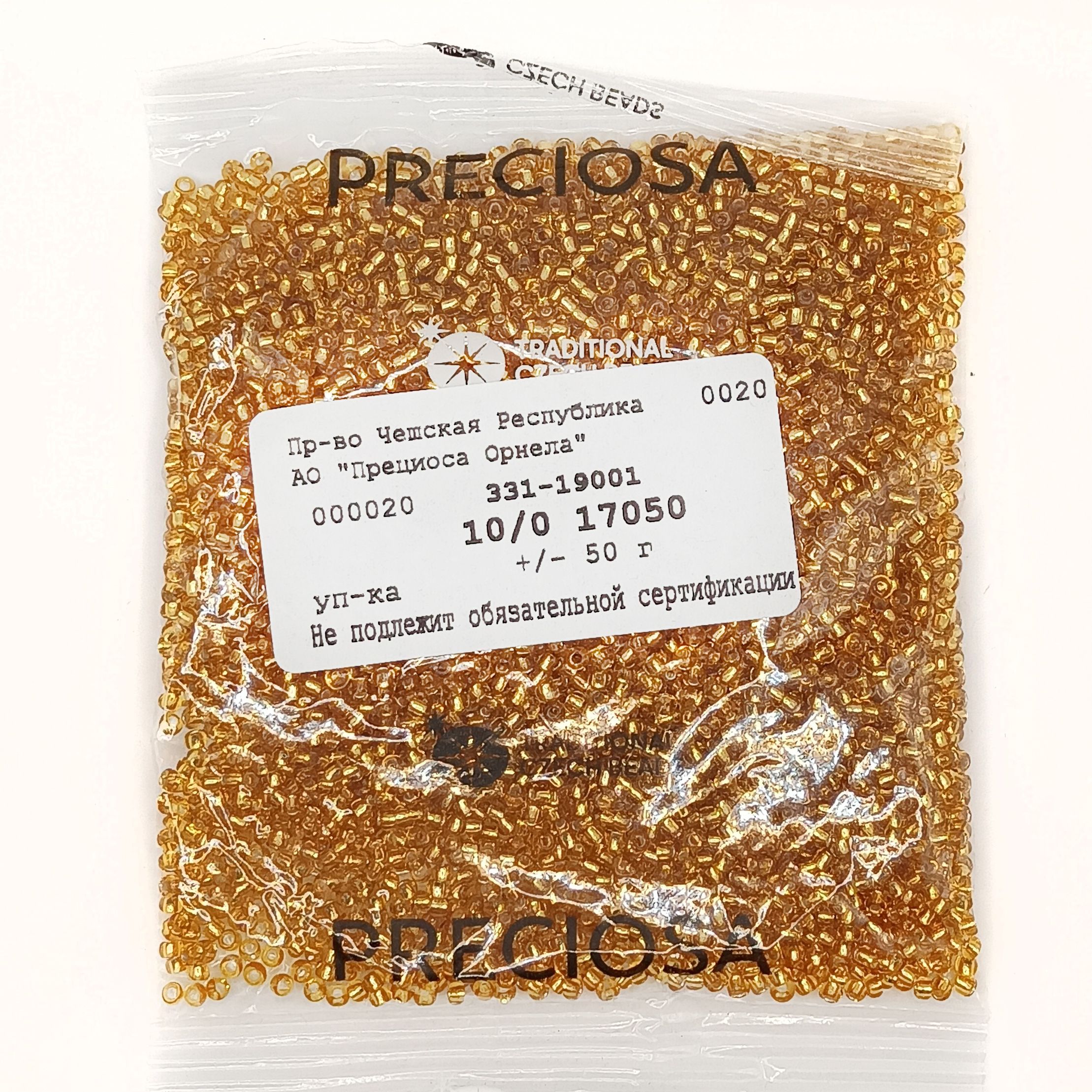 БИСЕР PRECIOSA 10/0 - 50г - 17050 ПРОЗРАЧНЫЙ С СЕРЕБРЯНОЙ ЛИНИЕЙ ВНУТРИ ЗОЛОТИСТЫЙ (ОГОНЁК)