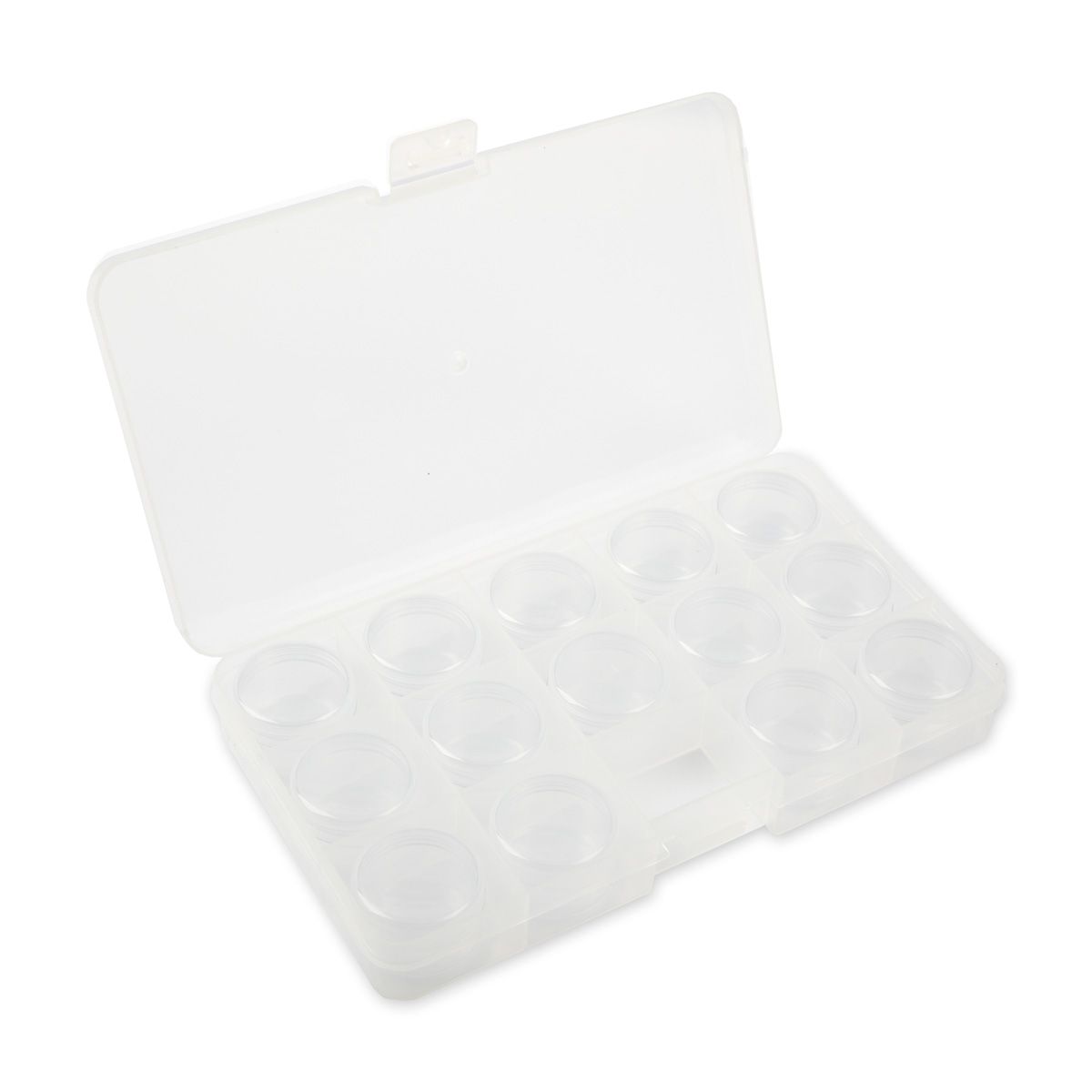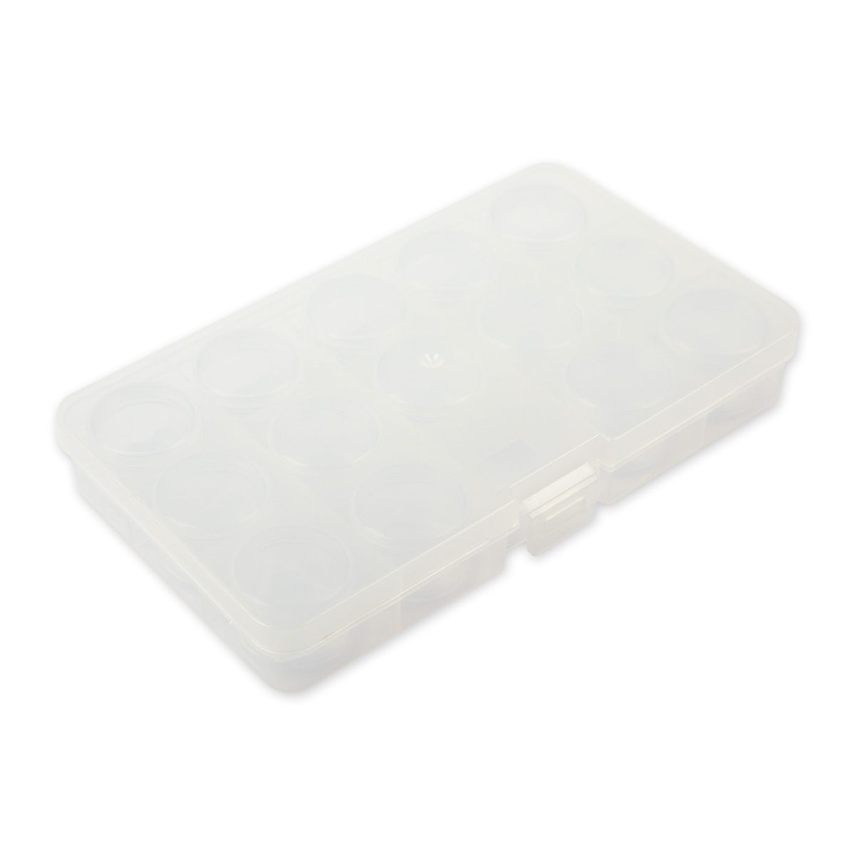 Коробка секционная прямоугольная, с защелкивающейся крышкой, 15 секций, укомплектован 14-ю тубами с закручивающимися крышками.. Предназначается для хранения мелочей для рукоделия и шитья, канцелярских принадлежностей. Общий размер коробки 17.7х10.2х2.3 см. Идеально подходит для хранения бисера и бусин.